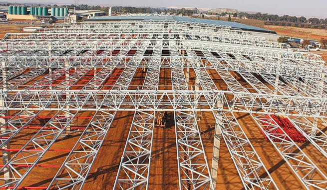 project required 616 tons of steel for its spaceframe structure, consisting of 140 main triangulated tubular trusses and 280 purlin trusses.